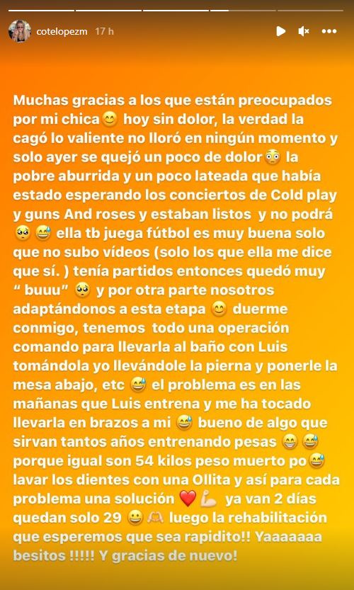 Tres días después de lo ocurrido, la modelo y empresaria utilizó su Instagram para agradecer a sus seguidores y seguidoras por la preocupación, asegurando que su hija está sin dolor. "La verdad la ca... lo valiente, no lloró en ningún momento y solo ayer se quejó un poco de dolor", dijo.
