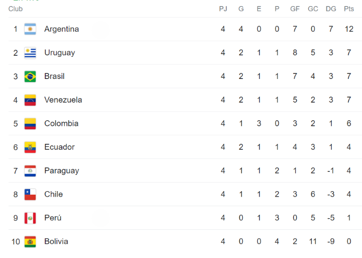 En cambio, Chile que fue goleado por Venezuela, apenas tiene cuatro puntos y se ubica octavo, solo superando a Perú y Bolivia, que ha perdido todos sus compromisos.