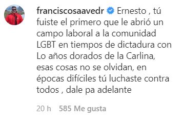 “Ernesto, tú fuiste el primero que le abrió un campo laboral a la comunidad LGBT en tiempos de dictadura con los años dorados de la Carlina, esas cosas no se olvidan, en épocas difíciles tú luchaste contra todos, dale pa’ adelante”, escribió en una publicación.