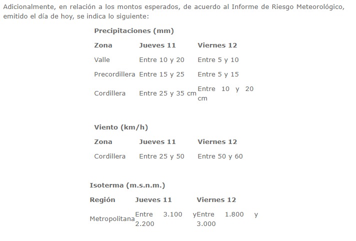 Debido a la cantidad de agua que se podría acumular en tan pocas horas, ONEMI advierte la “posibilidad de ocurrencia de remociones en masa (aluviones), deslizamientos y/o caídas de rocas (derrumbes)” en algunos sectores de la Región Metropolitana.