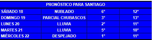 “Este sábado 18 de julio, parte de la región Metropolitana espera chubascos débiles”, detalla el meteorólogo de Chilevisión y CNN Chile, Eduardo Sáez, refiriéndose a las provincias de Cordillera, Maipo, Talagante y Melipilla. “En Santiago y Chacabuco podrían caer algunas precipitaciones solamente durante la tarde”, complementa.