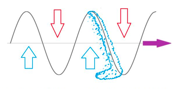 Ondas de este mismo tipo podemos encontrar en la naturaleza, así como las olas del mar, o las que suceden día a día en el choque de masas de aire que cruzan sobre nosotros. Son grandes oscilaciones que transportan toneladas de aire cálido y frío de un lugar a otro. En el hemisferio sur se vería similar a la imagen que sigue, en donde el aire cálido se desplaza hacia el sur, con mayor facilidad (flechas rojas) en los momentos que la onda se mueve hacia el sur (o hacia abajo) y, a la inversa, cuando la onda se mueve hacia el norte (hacia arriba) facilita el transporte de aire frío de sur a norte (flechas azules).