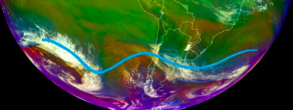 Y agreguemos un ingrediente más. En la línea negra, la onda que divide el aire cálido del norte y el frío del sur, en la parte derecha se forman los sistemas frontales, o sea las perturbaciones que nos dejan las lluvias. Por eso, después de una lluvia por sistema frontal, siempre hace mucho frío. Lo destaco en la imagen como una nube en borde celeste.