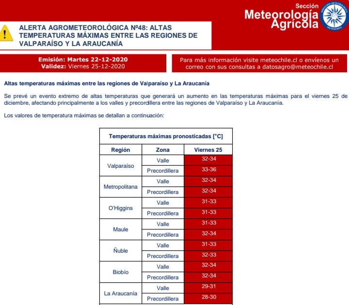 Coincide con lo anterior la Dirección Meteorológica de Chile (DMC) al emitir un aviso por “altas temperaturas para este 25 de diciembre desde la región de Valparaíso hasta la provincia de Malleco (La Araucanía)”. La entidad añade que este evento “afectará principalmente los sectores de valles y de la precordillera”.
