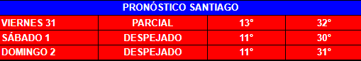 Este viernes se verá algo de nubosidad dispersa sobre la capital con 32° de máxima. Ya a la medianoche, el cielo despejado con una temperatura de 19° a 21°. El resto del fin de semana seguirá imperando el sol con máximas de 30° y 31° en el centro de Santiago.