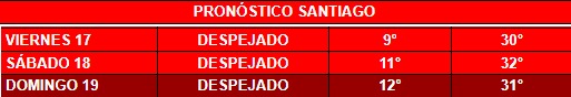 Este domingo predominará el cielo despejado sobre la Región Metropolitana, salvo por algunas nieblas matinales en el sector poniente del tramo. “La mínima rondará unos 12° y las máximas alcanzarían 31°-32° a la sombra en Santiago”, pronostica Sáez.