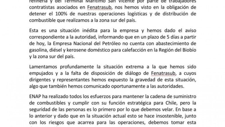 ENAP detuvo operaciones logísticas en el sur: En plazo de 5 días no cuenta con abastecimiento de combustibles