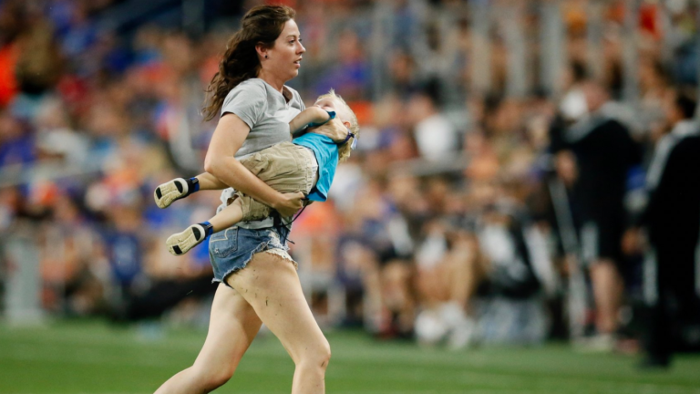 "Pura adrenalina": Niño ingresó a la cancha en medio de un partido de fútbol y su madre lo "tacleó" para frenarlo