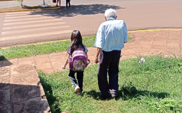 "Te amo, abuelito desconocido": Hombre de 88 años es viral por acompañar todos los días a su bisnieta al colegio
