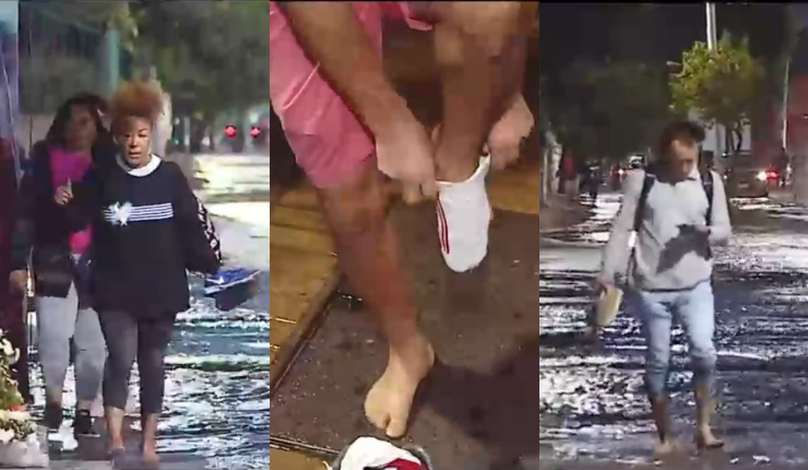 "No se puede caminar": La indignación de peatones que deben cruzar sin zapatos tras rotura de matriz en Recoleta
