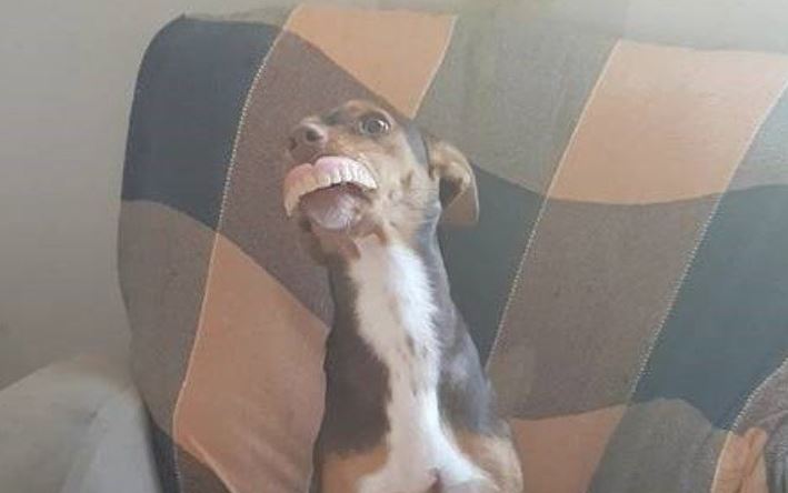 Las fotos de la perrita usando la dentadura postiza de una abuela que son sensación en redes sociales