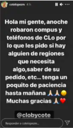 “Hola mi gente, anoche robaron compus y teléfonos de CLo, por lo que les pido que si hay alguien de regiones que necesita algo, saber de su pedido, etc… tenga un poquito de paciencia hasta mañana”, expresó López.