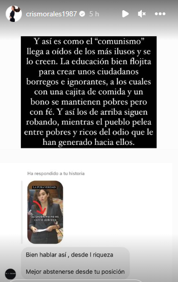 “Y así es como el ‘comunismo’ llega a oídos de los más ilusos y se lo creen. La educación bien flojita para crear unos ciudadanos borregos e ignorantes, a los cuales con una cajita de comida y un bono se mantienen pobres, pero con fe. Y los de arriba siguen robando, mientras que el pueblo pelea entre pobres y ricos del odio que le han generado hacia ellos”.