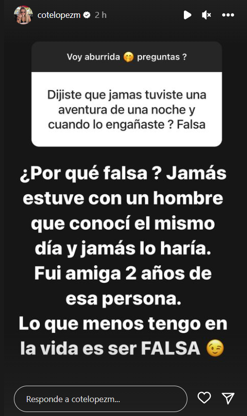 Ante esto, Coté no quiso quedar indiferente y contestó “¿por qué falsa? Jamás estuve con un hombre que conocí el mismo día y jamás lo haría”, añadiendo que “fui amiga 2 años de esa persona”.