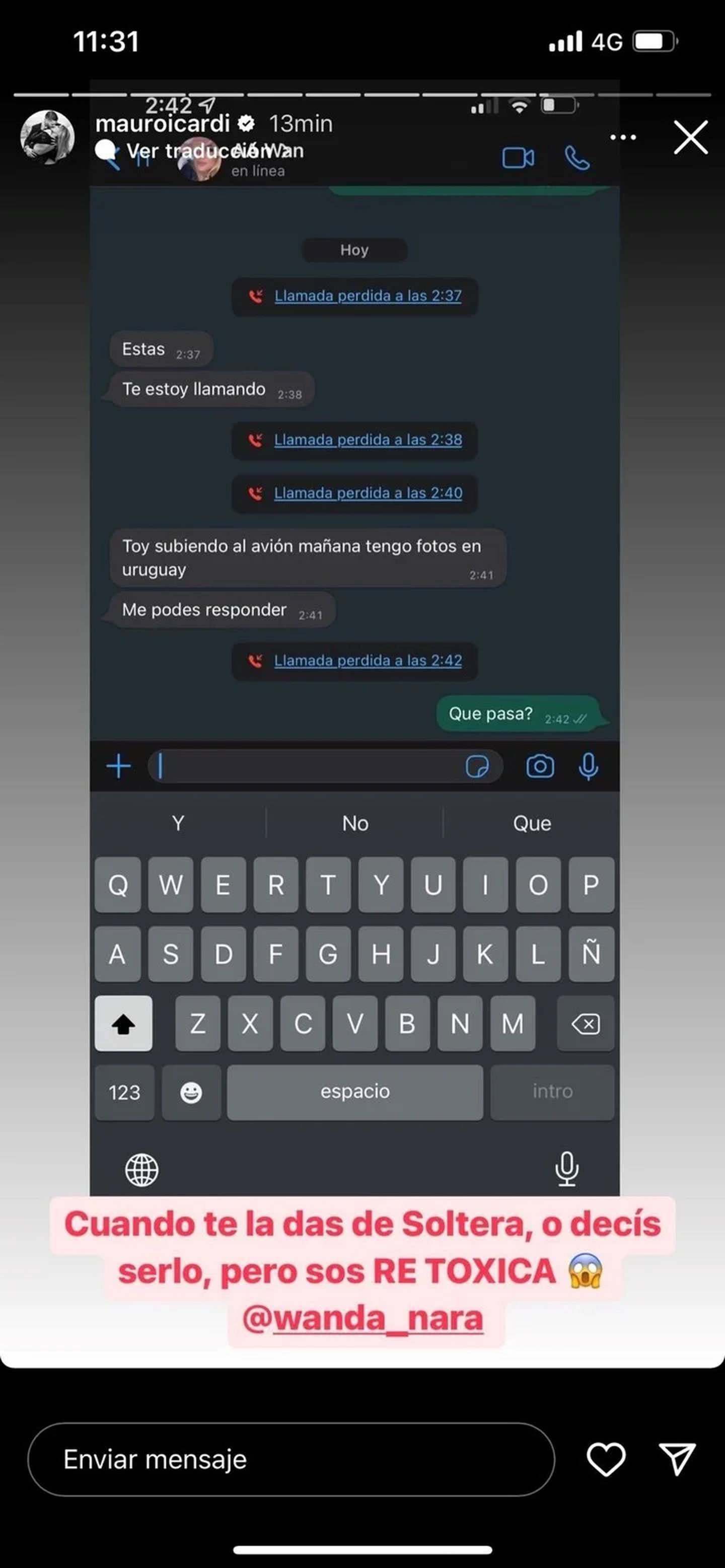 “Cuando te la das de soltera, o decís serlo, pero sos re tóxica”, escribió Mauro junto a una fotografía de una conversación en la que aparecían varios mensajes y llamadas perdidas.