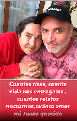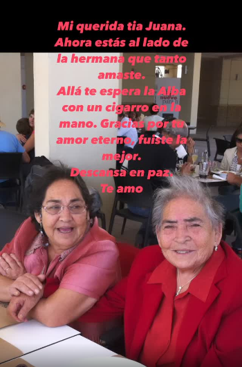 “Mi querida tía Juana, ahora estás al lado de la hermana que tanto amaste. Allá te espera la Alba con un cigarro en la mano. Gracias por tu amor eterno, fuiste la mejor. Descansa en paz, te amo”, escribió el artista nacional.