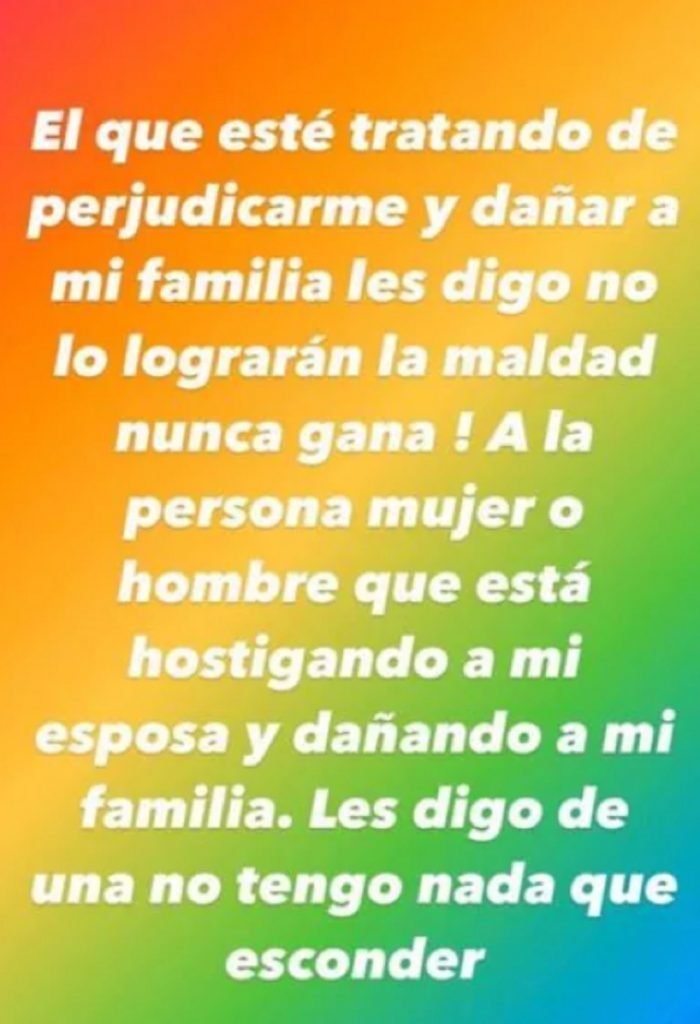 Posteriormente, agregó: “A la persona, mujer o hombre que está hostigando a mi esposa y dañando a mi familia. Les digo de una, no tengo nada que esconder”.
