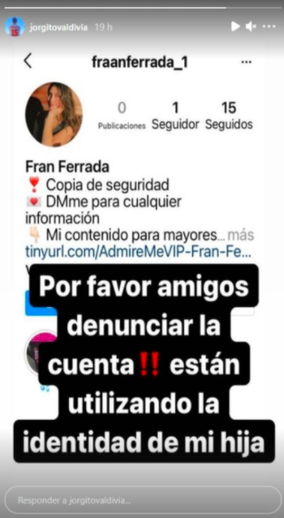 Recordemos que esta publicación surge luego de que Daniela Aránguiz y Luis Jiménez denunciaran la existencia de una cuenta en redes sociales que suplantaba la identidad de su hija, utilizando sus fotos pero bajo otro nombre: Fran Ferrada. En la descripción de dicha cuenta te lleva a un link de una supuesta venta de contenido erótico.