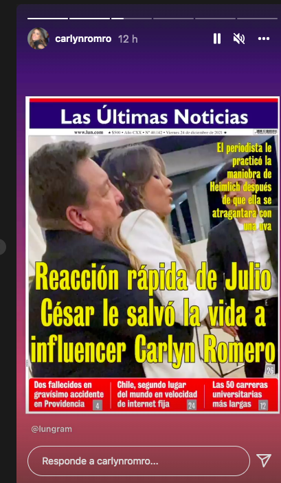Asimismo, el animador relató que hizo la maniobra tres veces, hasta que la influencer pudo botar la uva. “Las dos primeras las hice súper fuerte y la tercera vez con más técnica… ahí ella me tomó la mano y pudo hablar, me dijo ‘gracias’”. Revisa el relato del periodista aquí.