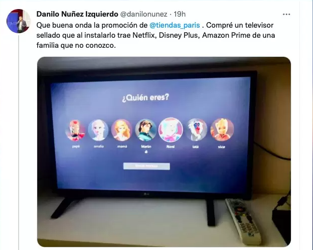 “Que buena onda la promoción de @tiendas_paris. Compré un televisor sellado que al instalarlo trae Netflix, Disney Plus, Amazon Prime de una familia que no conozco”, escribió el sujeto en su cuenta de Twitter.