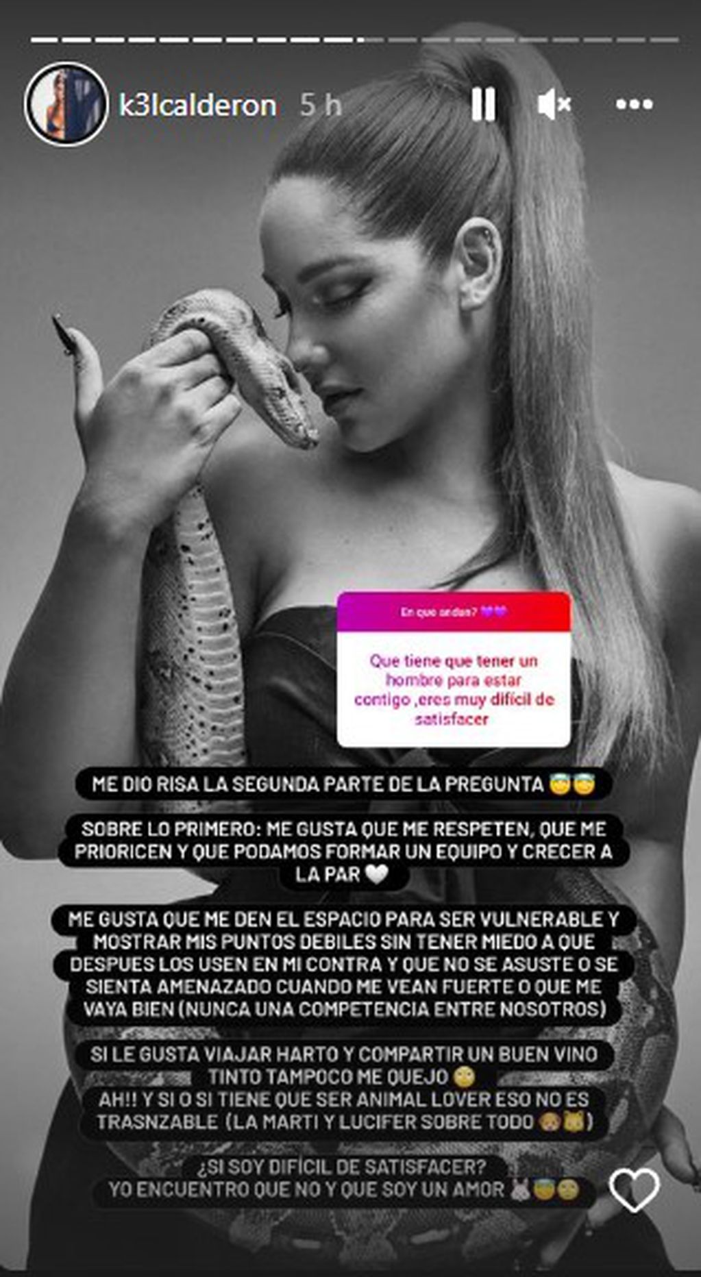 Además, comentó que le gustaría un hombre que no se sienta amenazado cuando le vaya bien, enfatizando que no quiere que se forme una competencia entre ambos. “Si le gusta viajar harto y compartir un buen vino tinto tampoco me quejo. AH!! Y sí o sí tiene que ser animal lover, eso no es transable (la Marti y Lucifer sobre todo)”, complementó refiriéndose a sus mascotas.