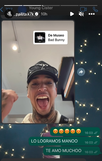 “Que buena noticia papito Dios, más feliz que la c…”, escribió en su primera publicación. No obstante, la que más llamó la atención de los fans fue una donde compartió la captura de una conversación con el intérprete de La Terapia, en la que se podía leer “lo logramos mano. Te amo mucho”.