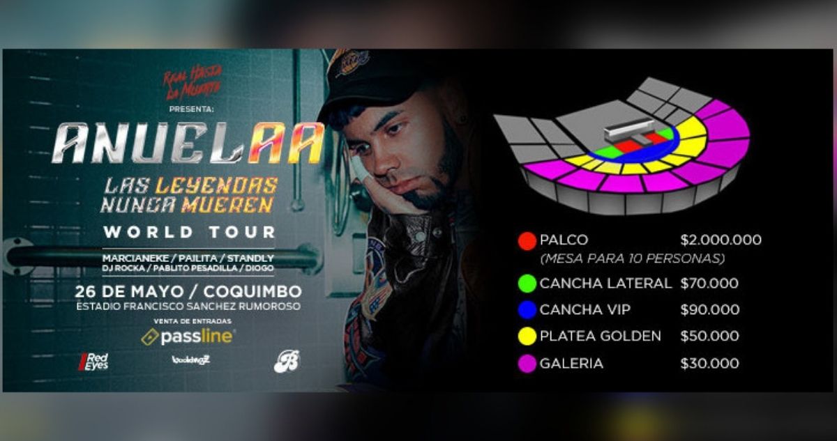 Sin embargo, el día de hoy salieron a la venta las entradas del show y el precio soprendió a los seguidores. Para el primer concierto de Anuel AA en Chile, el 26 de mayo de en Coquimbo, las entradas se pueden comprar por el sistema Passline. Los valores van desde los $30.000 en sector de galería, hasta los $2 millones en palco (mesa para 10 personas).