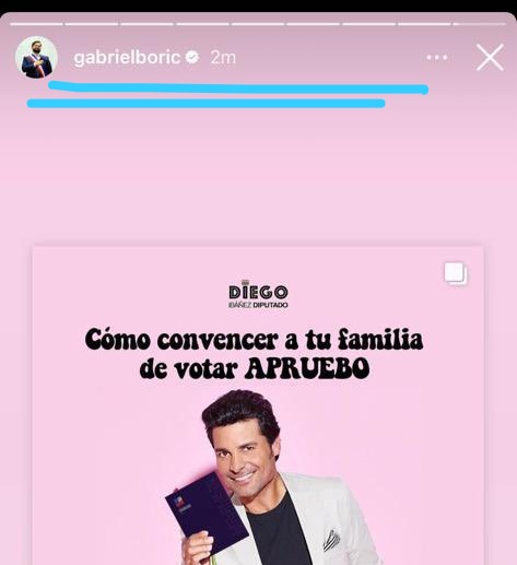 La publicación —que horas más tarde fue borrada de las stories de la cuenta de Boric— mostraba una foto editada del cantante puertorriqueño Chayanne junto con la propuesta de la Nueva Constitución, además del título: “Cómo convencer a tu familia de votar Apruebo”