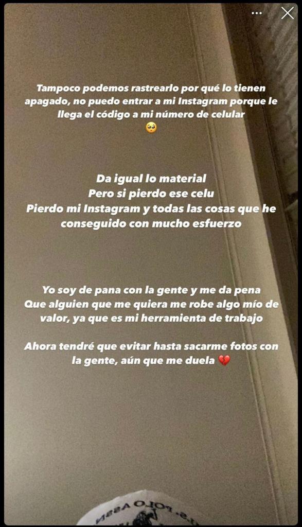 Lejos de emitir un mensaje amenazante y como acostumbra a referirse a sus fanáticos, Pailita pidió a "la personita" responsable que se retracte del acto. "Yo soy de pana con la gente y me da pena que alguien que me quiera me robe algo mío de valor, ya que es mi herramienta de trabajo", fue parte de lo que añadió más tarde, en la siguiente historia: