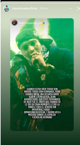 Luego de estas reflexiones, recibió el apoyo de artistas del género urbano como Balbi. "Cuando estás bien, todos son amigos, hermanos, pero cuando viene una decaída nadie quiere estar cerca. Sean agradecidos que, este personaje de aquí (Marcianeke), fue el único que le dió la mano a todo el género, sin importar nada y ahora los veo a muchos dando la espalda. Fuerza mi hermano", fue el escrito del cantante en apoyo de su colega, quien posteó la imagen.