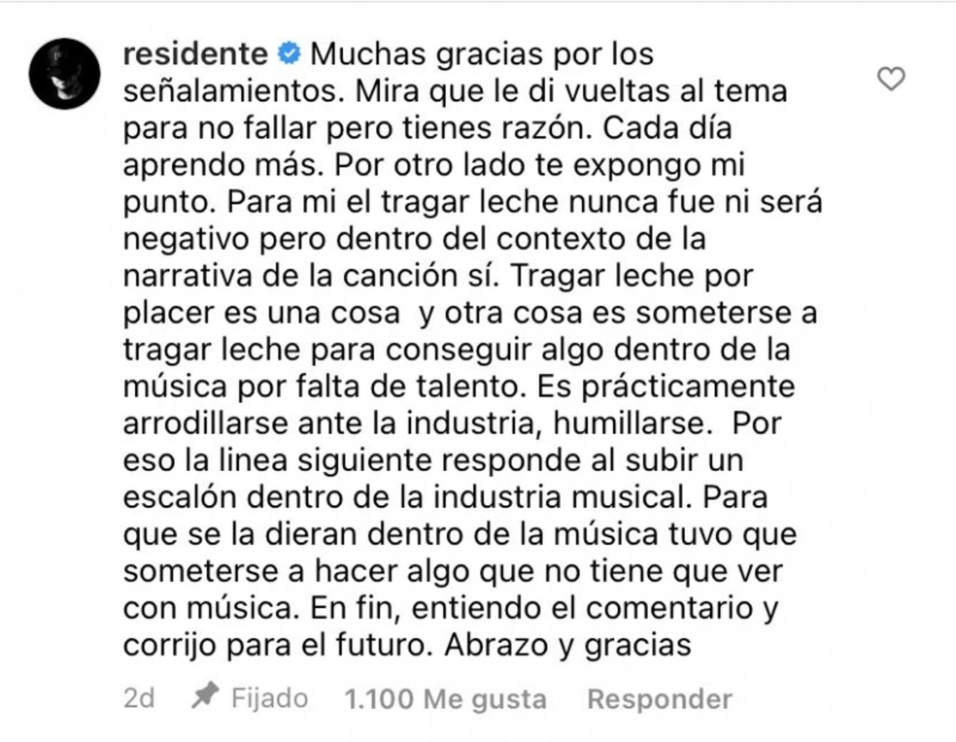 Concluyó su réplica con: “Por otro lado, te expongo mi punto. Para mi el ‘tragar leche’ nunca fue ni será negativo, pero dentro del contexto de la narrativa de la canción sí. Tragar leche por placer es una cosa y otra cosa es someterse a tragar leche para conseguir algo dentro de la música por falta de talento. Es prácticamente arrodillarse ante la industria, humillarse. Por eso, la línea siguiente responde al subir un escalón dentro de la industria musical. Para que se la dieran dentro de la música tuvo que someterse a hacer algo que no tiene que ver con música. En fin, entiendo el comentario y corrijo para el futuro. Abrazo y gracias”.