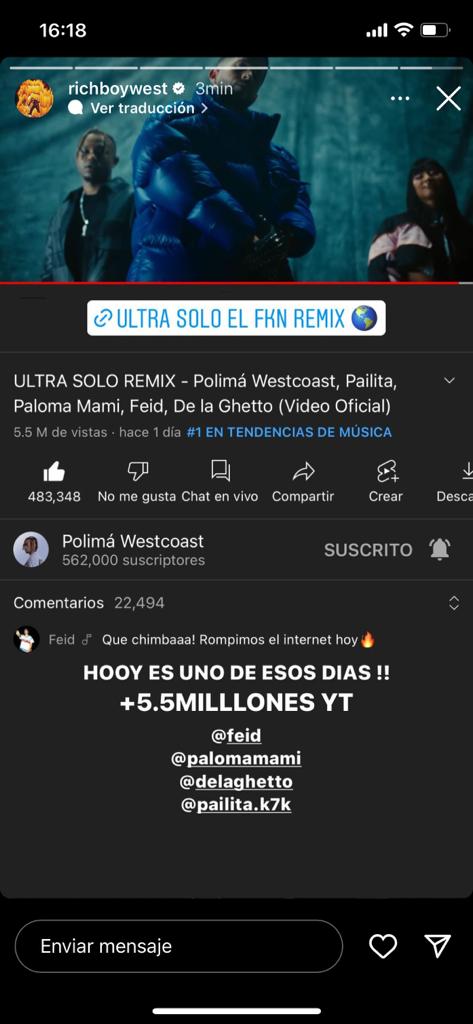 El músico y rapero chileno, Polimá Ngangu Orellana, más conocido como "Polimá WestCoast", comunicó en su cuenta de Instagram que está muy feliz por haber alcanzado 5,5 millones de reproducciones en su nuevo vídeo musical, "Ultra Solo Remix" en tan solo 24 horas, donde colabora con "Pailita", "Paloma Mami", "Feid" y "De la Ghetto".