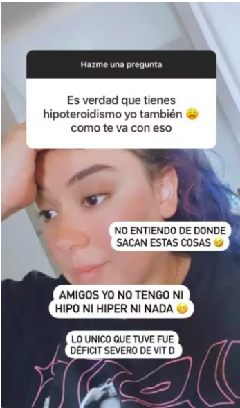 “¿Es verdad que tienes hipotiroidismo? Yo también. Cómo te va con eso”, fue lo que le consultó unos de sus seguidores, ante esto, la estudiante de Fonoaudiología afirmó en una publicación: ”No entiendo de dónde sacan estas cosas. No tengo ni hipo, ni híper ni nada. lo único que tuve fue déficit severo de Vit D (Vitamina D)”.