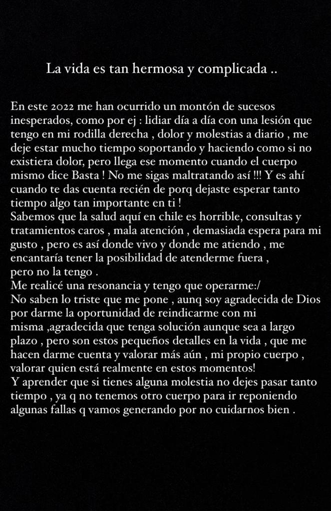 A través de sus historias de Instagram, la mujer criticó duramente al sistema de salud del país y confesó lo triste que estaba por el diagnóstico:“La vida es tan hermosa y complicada. En este 2022 me han ocurrido un montón de sucesos inesperados, como por ejemplo, lidiar día a día con una lesión que tengo en mi rodilla derecha”.