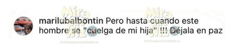"Pero hasta cuándo este hombre se ‘cuelga de mi hija’. Déjala en paz", habría sido el comentario de Balbontín en la publicación que reposteó Sonia Valenzuela en sus redes. Sin embargo, horas más tarde habría sido eliminado el escrito.