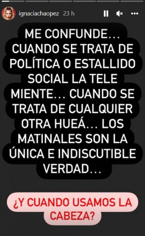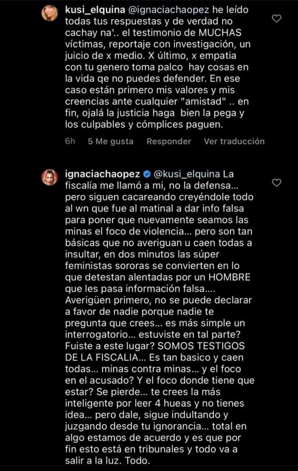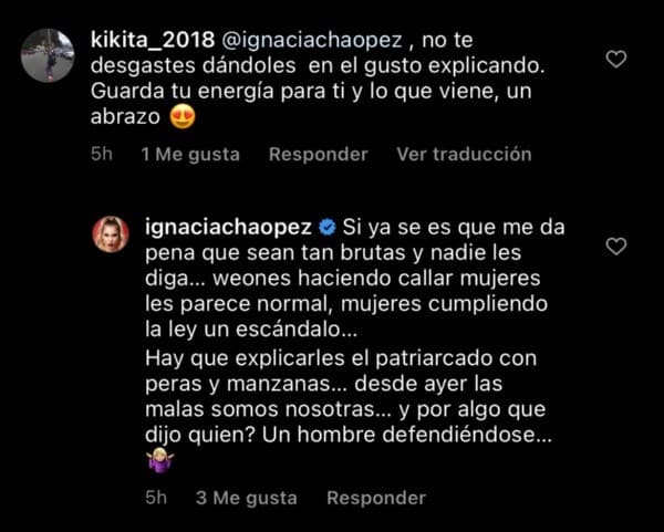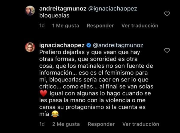 Posteriormente, agregó: “prefiero dejarlas y que vean que hay otras formas, que sororidad es otra cosa, que los matinales no son fuente de información. Eso es el feminismo para mí, bloquearlas sería caer en ser lo que crítico…como ellas…al final se van solas” y que “me da pena que sean tan brutas y que nadie les diga”.