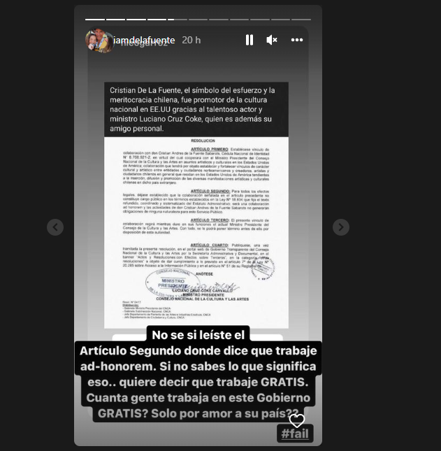 Tras esto. el actor se defendió y publicó una historia de Instagram con lo siguiente: “No sé si leíste el Artículo Segundo donde dice que trabajé ad-honorem. Si no sabes lo que significa eso, quiere decir que trabajé gratis”. Pero eso no es todo, también aprovecho el espacio para arremeter contra las autoridades actuales: “¿Cuánta gente trabaja en este gobierno gratis, solo por amor a su país?”.
