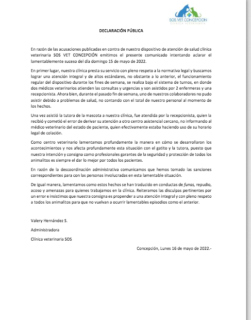 “Como centro veterinario lamentamos profundamente la manera en cómo se desarrollaron los acontecimientos y nos afecta profundamente esta situación con el gatito y la tutora, puesto que nuestra intención y consigna como profesionales garantes de la seguridad y protección de todos los animalitos es siempre el dar lo mejor por todos los pacientes”, agregaron.