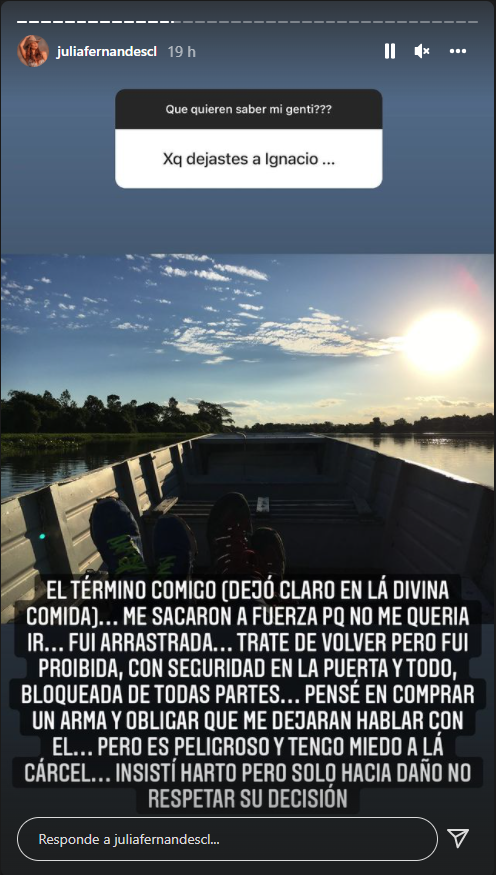 Fue a través de sus Instagram Stories, en donde la influencer contestó variadas preguntas de sus seguidores, que reveló la impactante anécdota. Una de las preguntas que suele recibir insistentemente es “¿Por qué dejaste a Ignacio?”. Esta vez, la jóven no se quedó callada y realizó importantes aclaraciones.