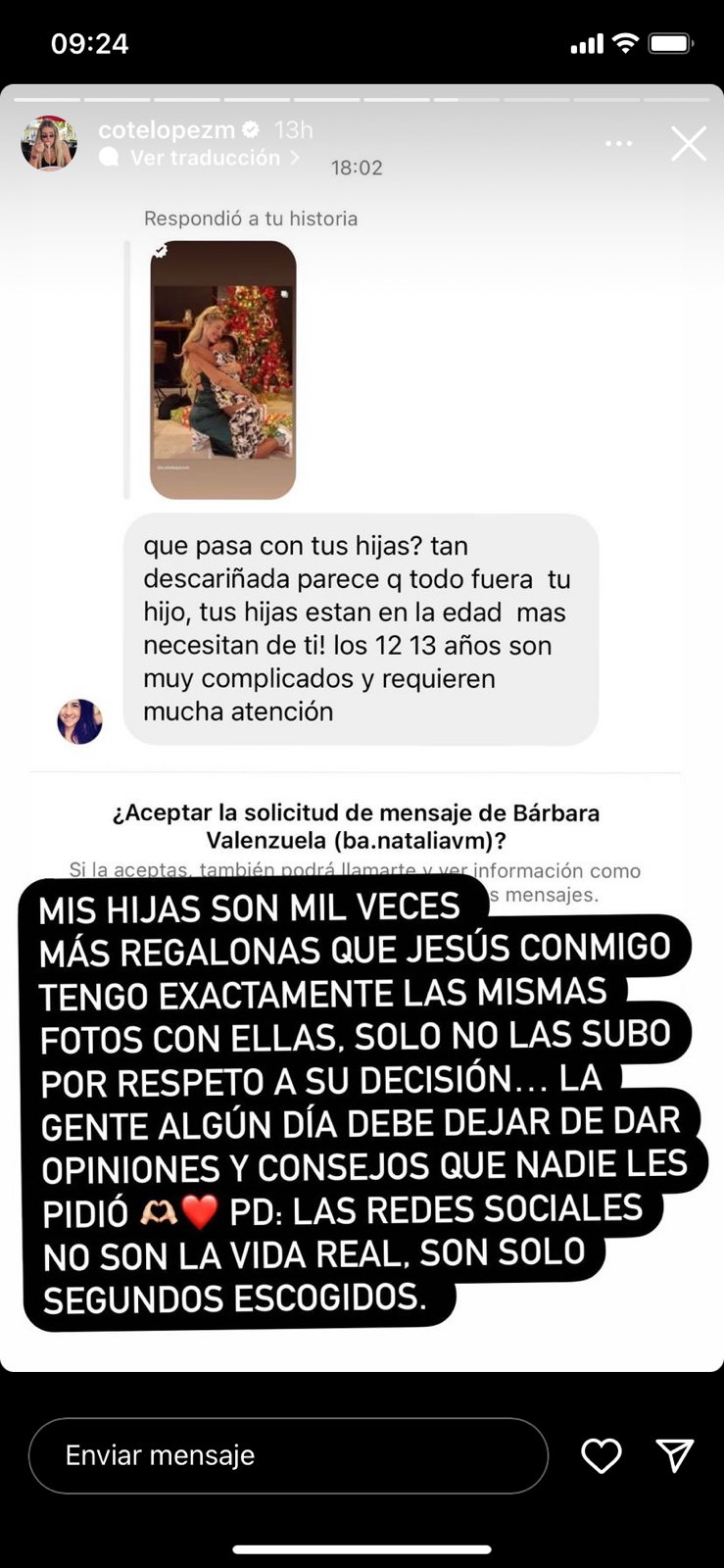 Por su parte, Cote no quiso quedarse callada y le respondió con todo. “Mis hijas son mil veces más regalonas que Jesús conmigo. Tengo exactamente las mismas fotos con ellas, sólo no las subo por respeto a su decisión”, se defendió.