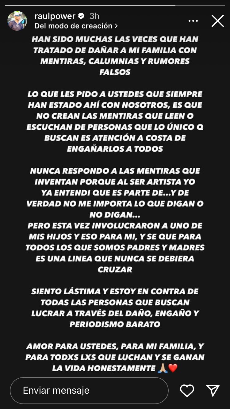 “Han sido muchas las veces que han tratado de dañar a mi familia con mentiras, calumnias y rumores falsos”, comenzó escribiendo el bailarín de Power Peralta.
