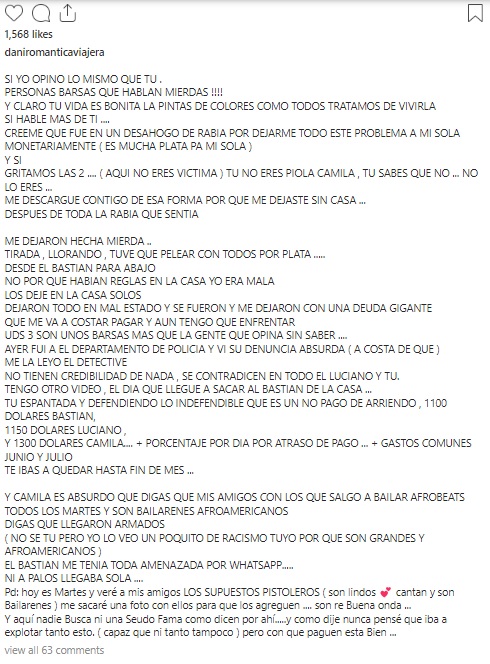 “Sí, yo opino lo mismo que tú. ¡Personas ‘barzas’ que hablan mierdas! Y claro, tu vida es bonita. La pintas de colores como todos tratamos de vivirla. Sí, hablé mal de ti… Créeme que fue un desahogo de rabia por dejarme todo este problema a mí sola monetariamente”, señaló la ex arrendataria.