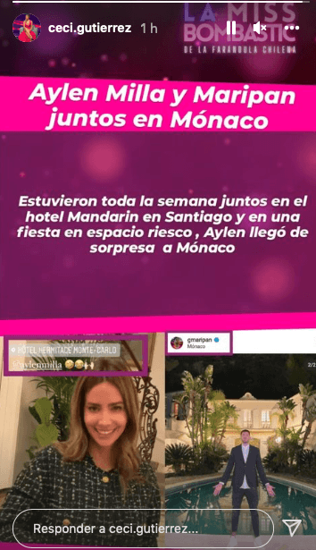 La comunicadora a través de sus redes sociales asegura que la ex participante de Amor a Prueba fue de sorpresa a Mónaco a visitar al jugador de la Ligue 1: “Aylén Milla y Maripán juntos en Mónaco. Estuvieron toda la semana juntos en el hotel Mandarín en Santiago, y en una fiesta en Espacio Riesco, Aylén llegó de sorpresa a Mónaco”.