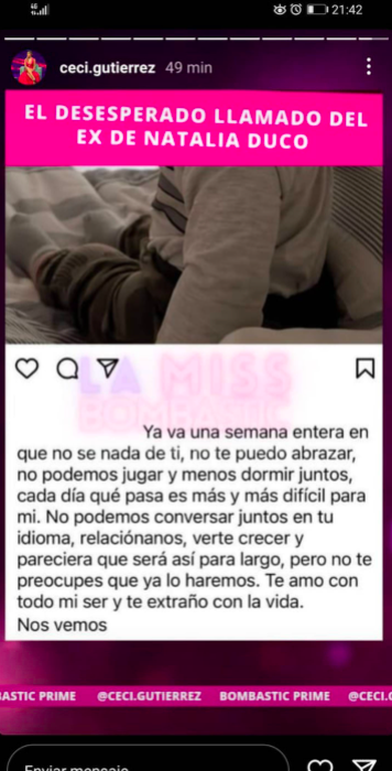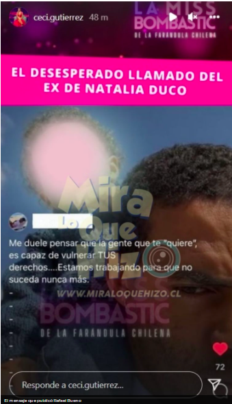 La ex pareja de Natalia Duco, Rafael Bueno, hizo un llamado en redes sociales para poder ver al pequeño hijo que tiene con la deportista. En las historias de Instagram se puede ver el reclamo que hace el hombre, señalando que hace una semana que no sabe nada de él, y que tampoco hay indicios de un posible encuentro.