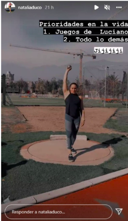 Sin dar nombres ni apuntar a su ex pareja, la atleta subió una serie de videos y fotografías a su historia de Instagram en las que se le ve entrenando junto a su hijo y un par de escuetas frases ante lo que ella definió como “prioridades en la vida”. “1.- Juegos de Luciano. 2.- Todo lo demás, jijijiji”, señaló Duco, en sus redes sociales.
