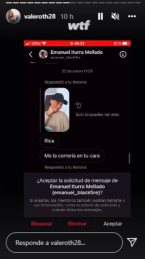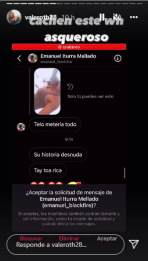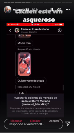 La ex chica reality, Valentina Roth, compartió su molestia en redes sociales tras publicar las reacciones de un usuario quien le escribía diciéndole cosas subidas de tono sin conocerlo.