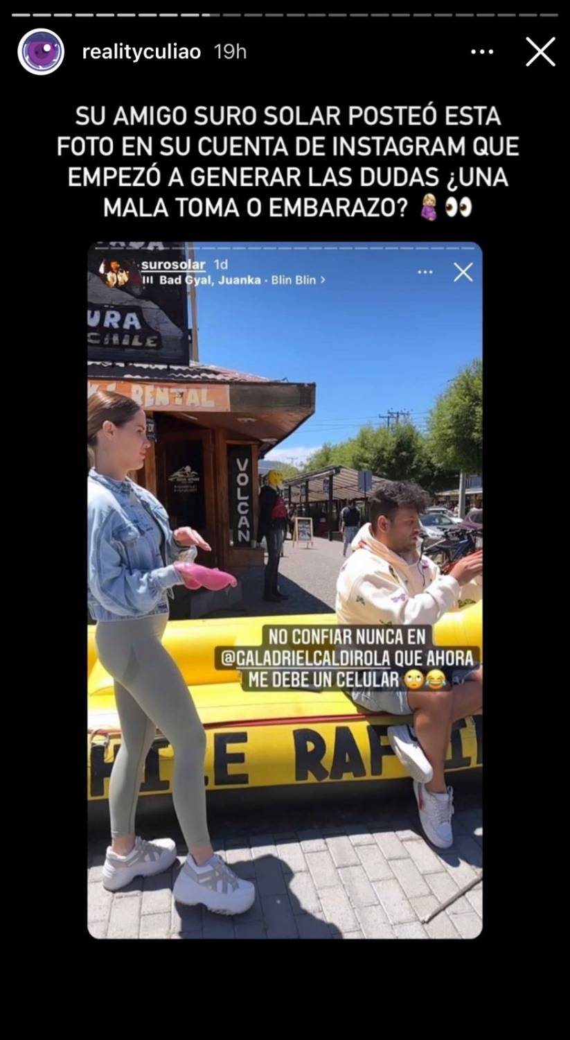 "Su amigo Suro Solar posteó esta foto en su cuenta de Instagram que empezó a generar las dudas", fue lo que escribió la cuenta dedicada al espectáculo chileno. Posteriormente, la misma cuenta dio cuenta que la ex Discípulo del Chef reposteó la postal de su cercano pero utilizó unos emojis para ocultar su abdomen.