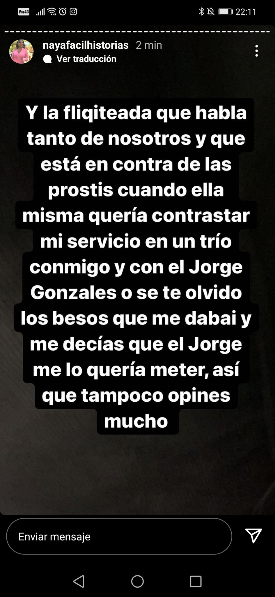 Posteriormente, la influencer entregó su versión de los hechos. En su cuenta de Instagram, Naya expresó que Daniela quería realizar un trío con ella y el músico: "Y la fliqiteada que habla de nosotros y que está en contra de las protis cuando ella misma quería contratar mi servicio en un trío conmigo y con Jorge González, ¿se te olvido los besos que me dabas? Me decías que Jorge me lo quería meter, así que tampoco opines mucho".