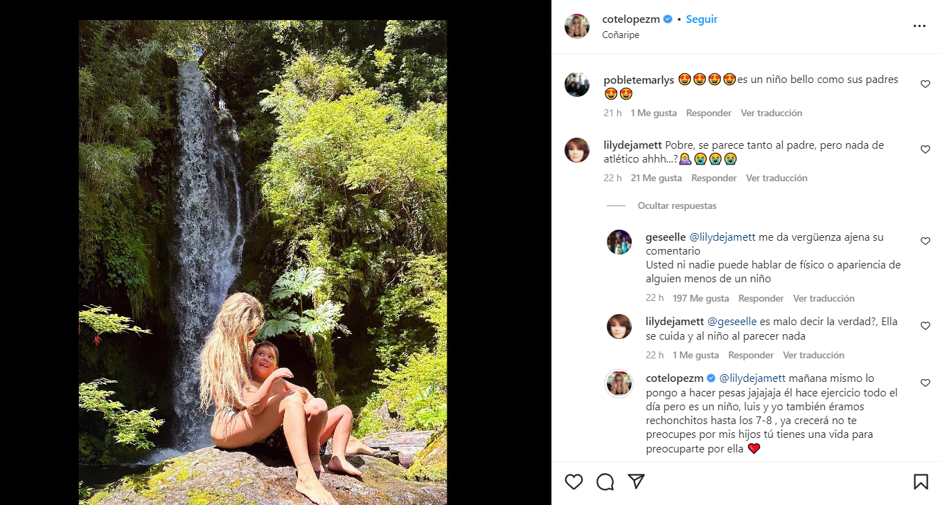 “Pobre. Se parece tanto al padre, pero nada atlético, ¿ah?”, escribió una mujer, quien casi al instante recibió una ola de críticas de otras seguidoras de la influencer debido a que no tenía por qué opinar de cuerpos ajenos.