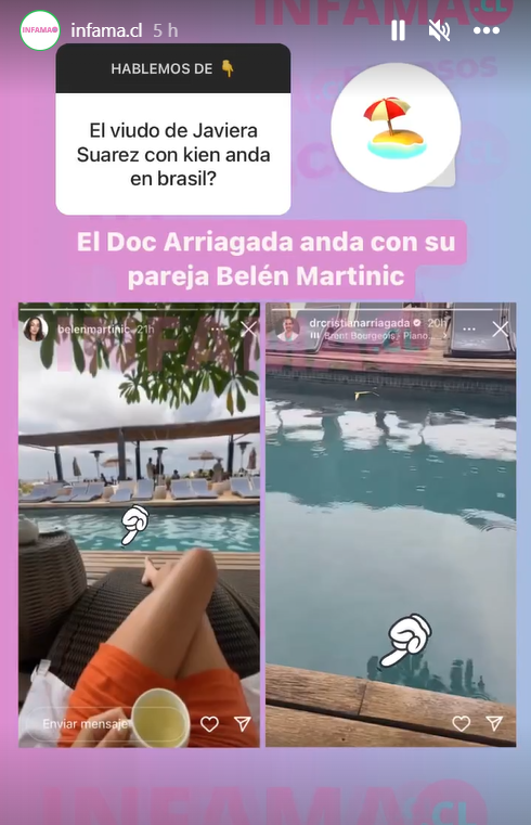 “El doc Arriagada anda con su pareja Belén Martinic”, escribió el medio en una de sus historias donde mostró imágenes que delataría que ambos se encuentran en el mismo lugar en Brasil.